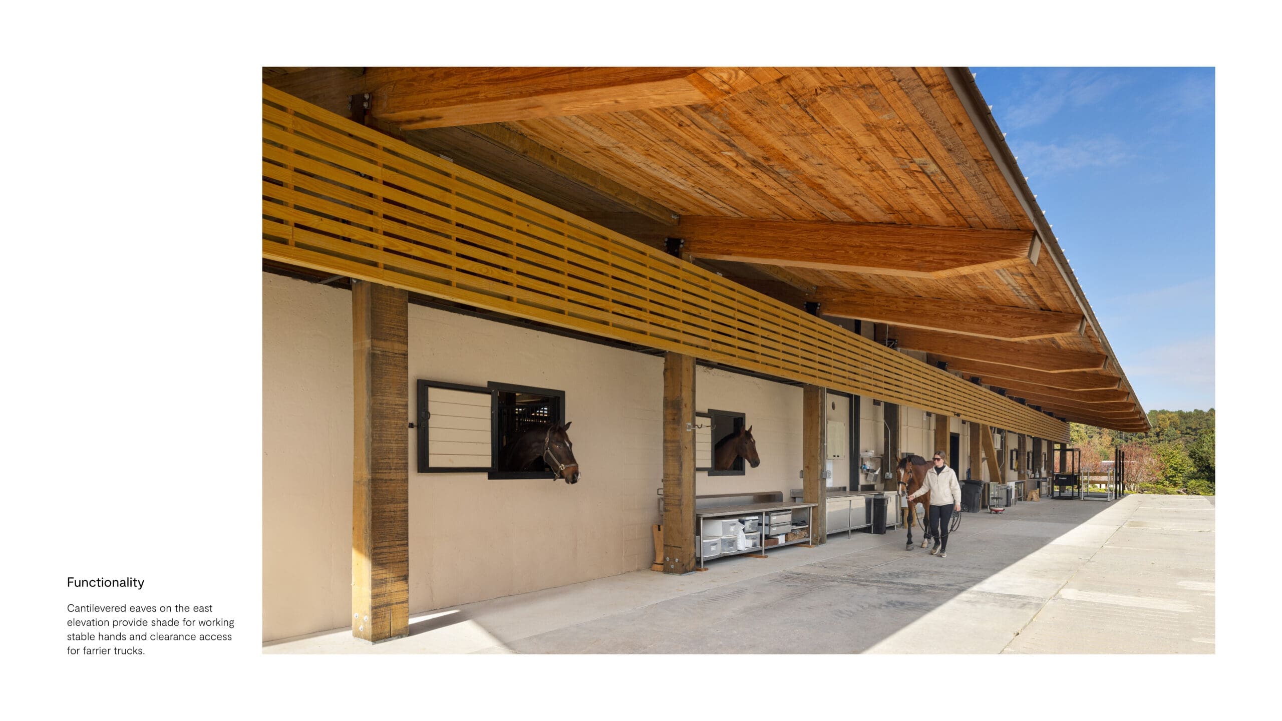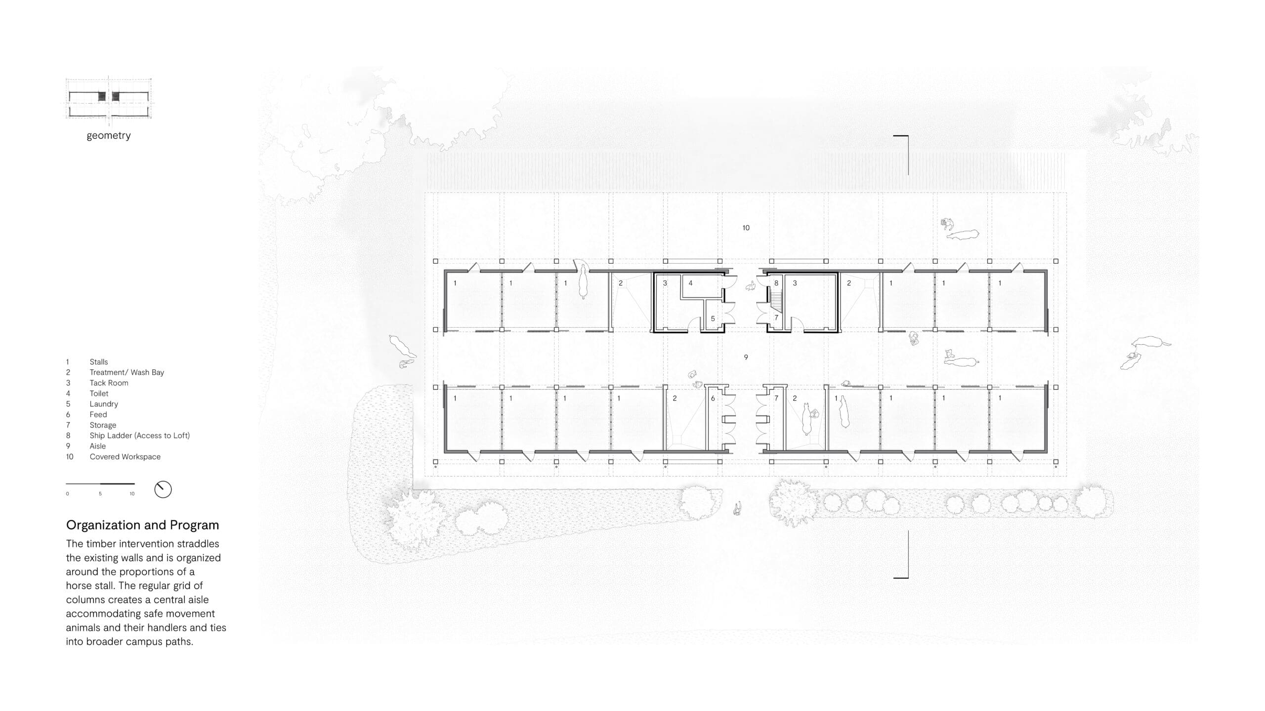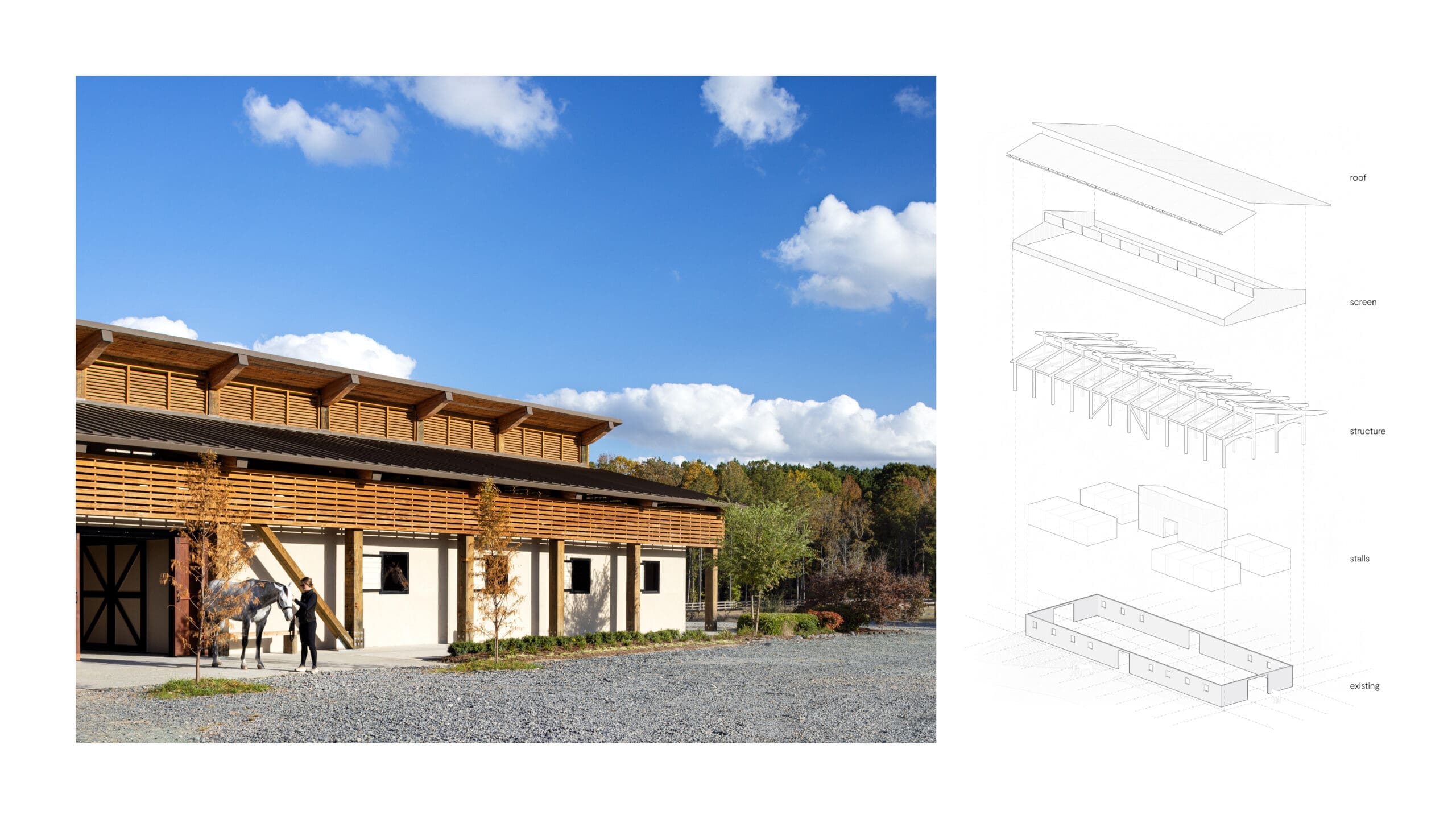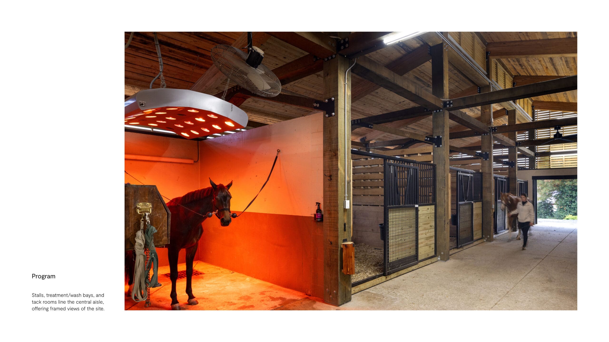 The roof and screen intervention span the existing walls using a timber column and glulam beam system. The regular grid of columns is based on the dimensions of a horse stall and creates a central aisle for the safe movement of animals and handlers.