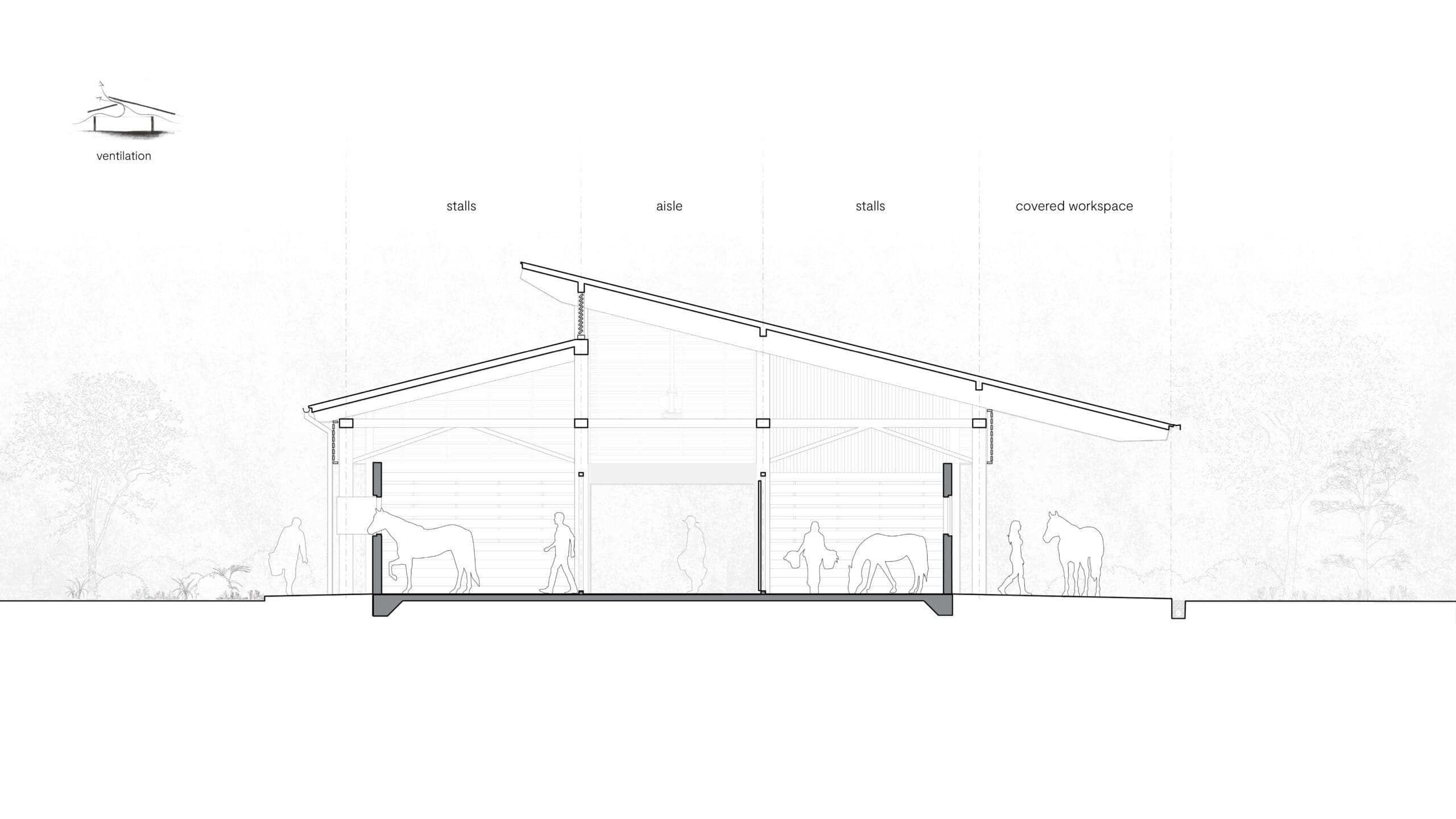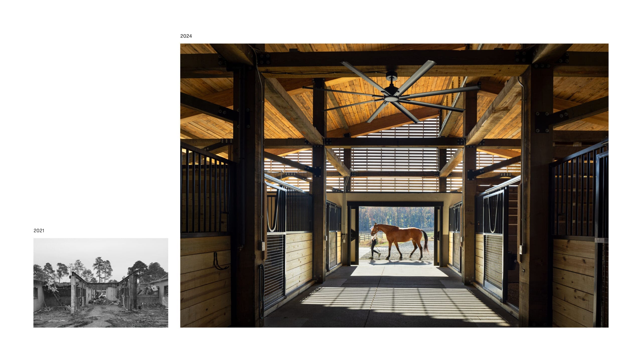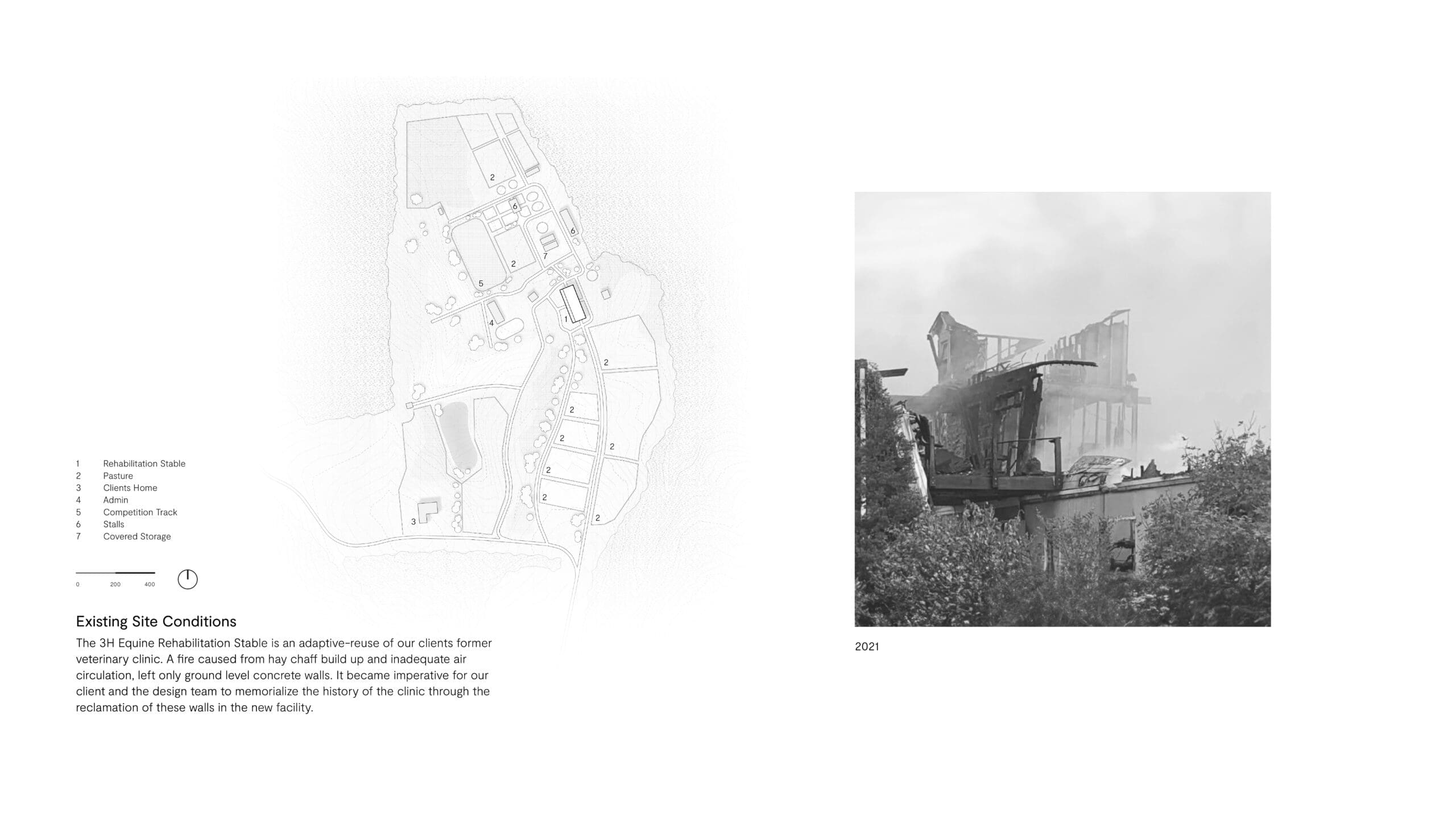 The 3H Equine Rehabilitation Stable is an adaptive reuse of our client’s former veterinary clinic, which was severely damaged by a fire caused by hay chaff accumulation due to inadequate air circulation. Only the ground-level concrete walls survived. It became essential for both the client and the design team to honor the memory of the original clinic by incorporating these walls into the new facility's design.