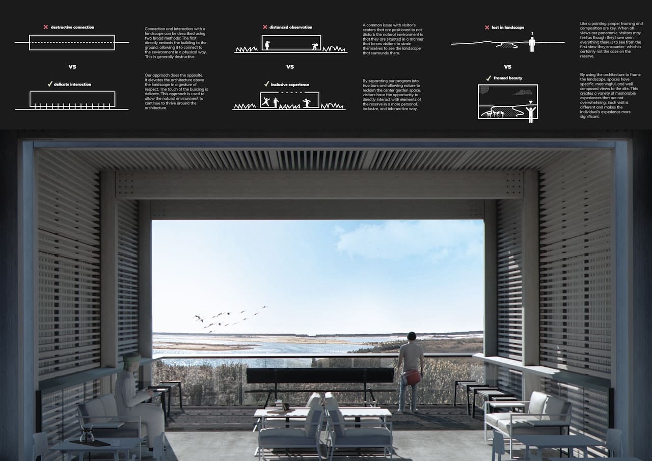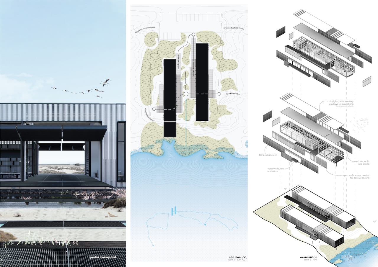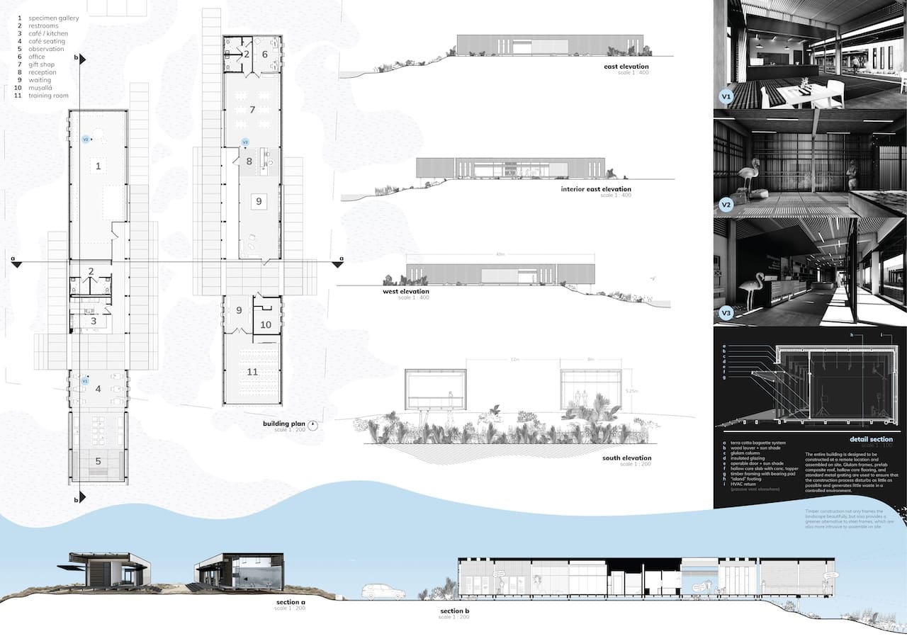 This proposal for a wildlife center embraces the surrounding natural systems offering spaces for education and observation. Two parallel timber-framed structures are clad in a system of terracotta baguettes and contain galleries, teaching spaces and visitor amenities. The building skin allows for natural ventilation and light to pass through spaces in controlled amounts. Conscious of the delicate habitat for which the facility is conceived, only a slight portion of each building is allowed to encroach into the nature reserve. From here views for visitors are framed.