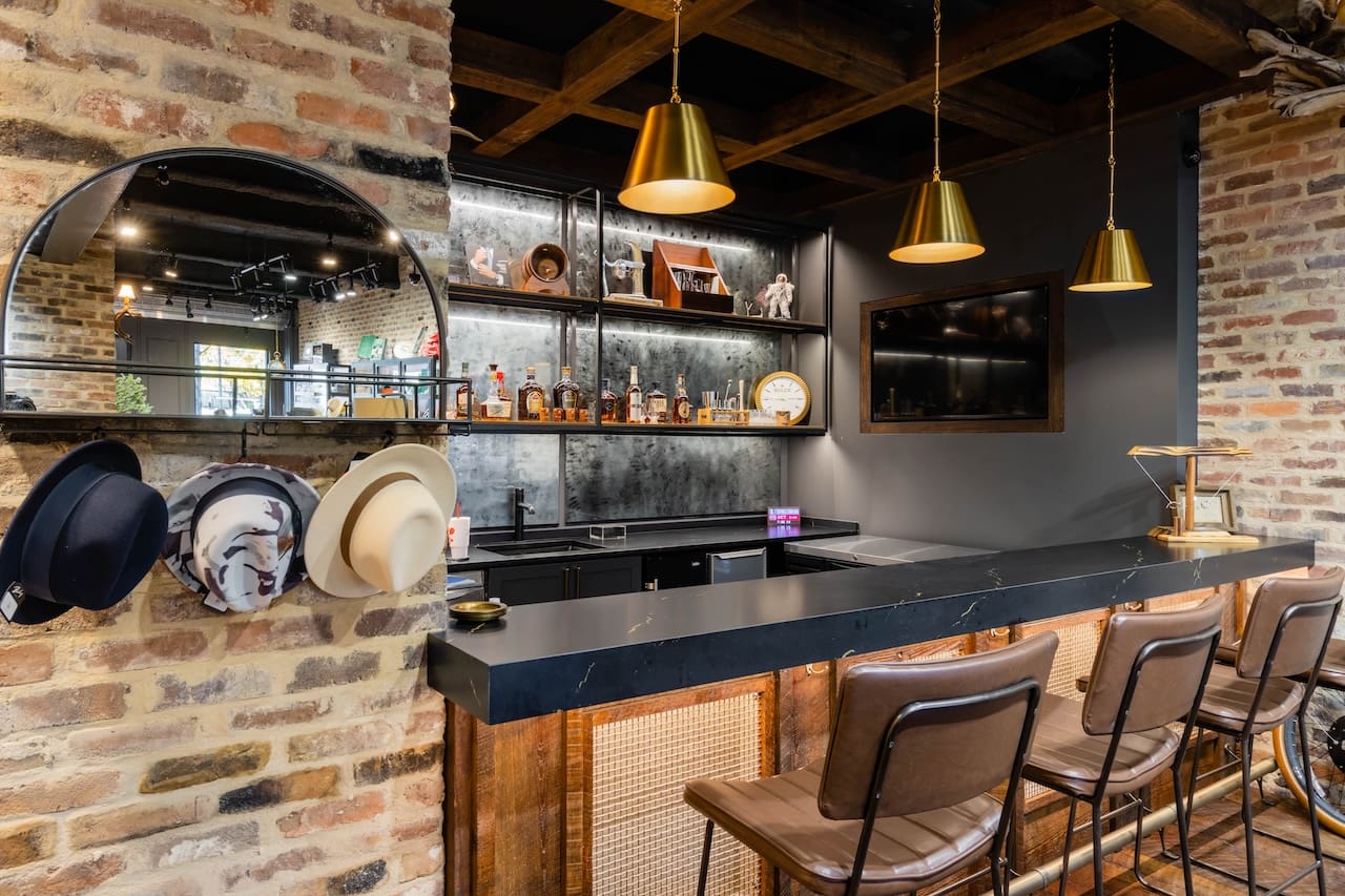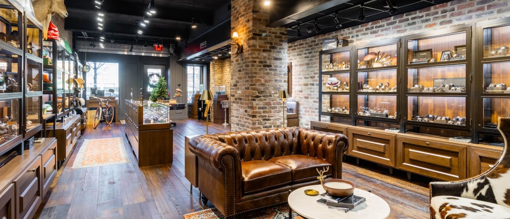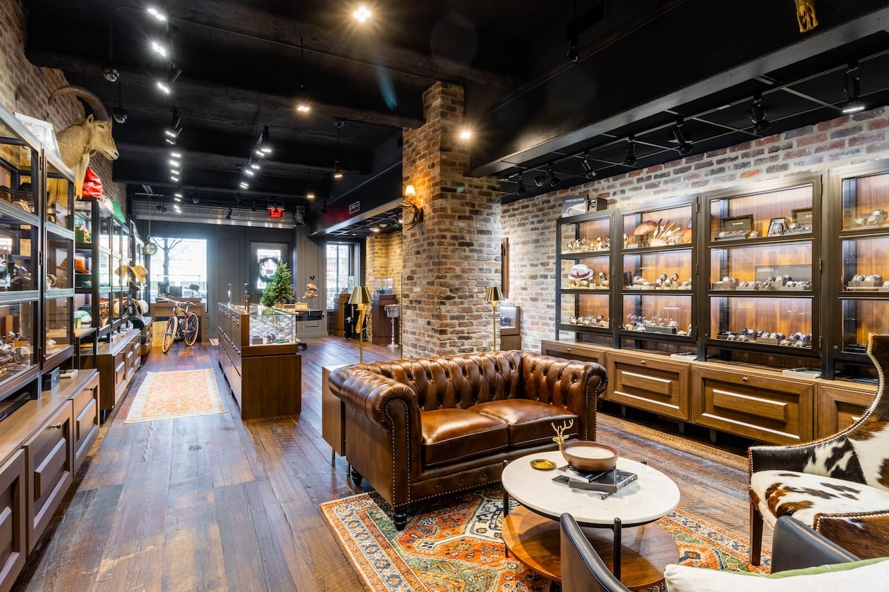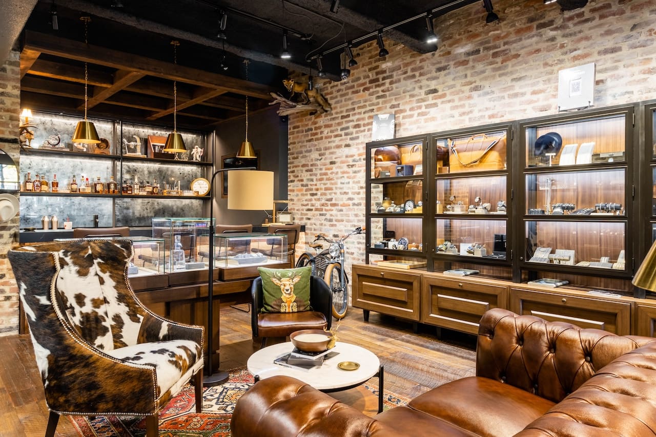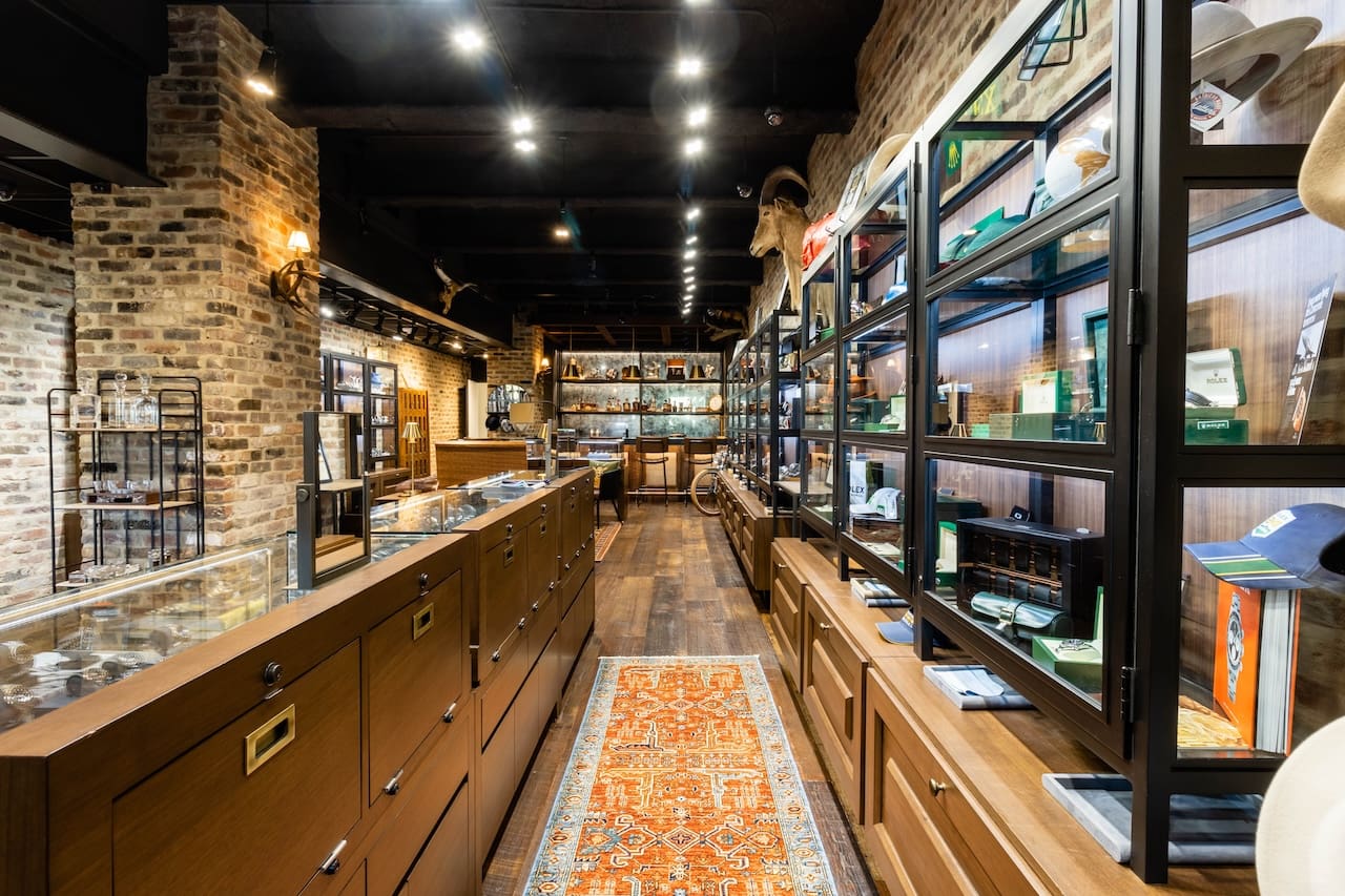 Located in The Village District, a prominent Raleigh shopping destination, a well-established jeweler has expanded their offerings with this bespoke men’s watch store. Presented as a speakeasy, clients are encouraged to linger, relax, and enjoy a craft cocktail while considering their next purchase. Reclaimed materials, exposed existing brick walls, low ambient lighting and warm natural materials frame merchandise and enrich the atmosphere.