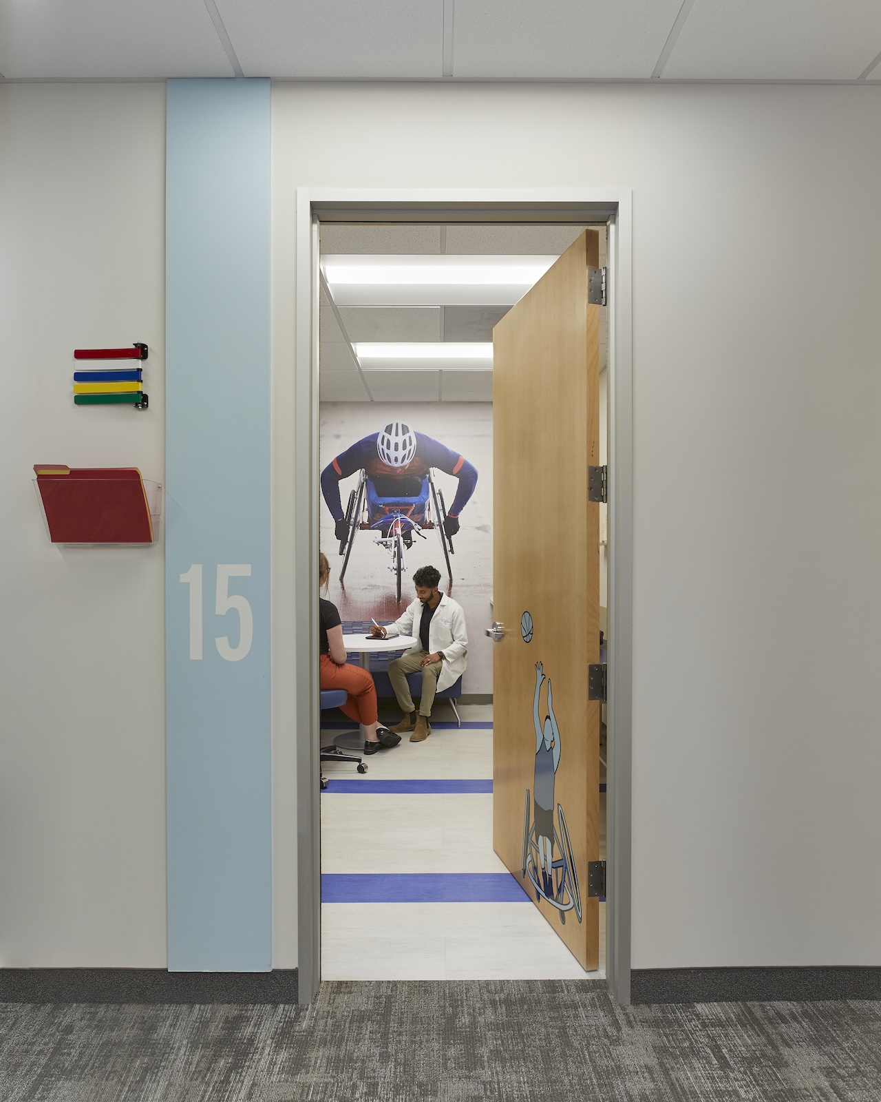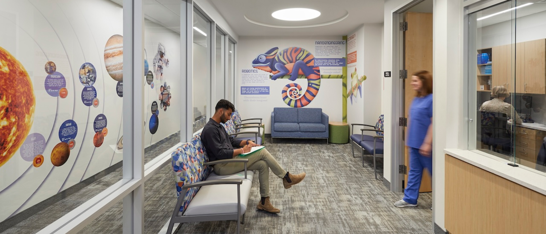 Original, custom wall graphics and an interactive exhibit clarify circulation and enhance the user experience. The content of the art acts as conversational prompts to foster conversation and build rapport among children, caregivers, and physicians.