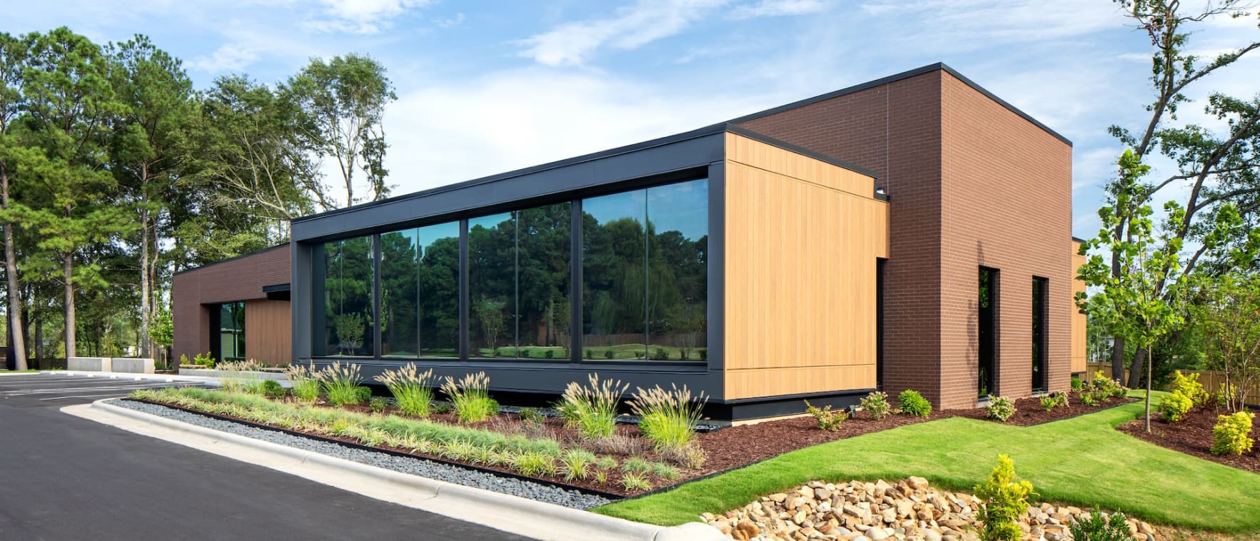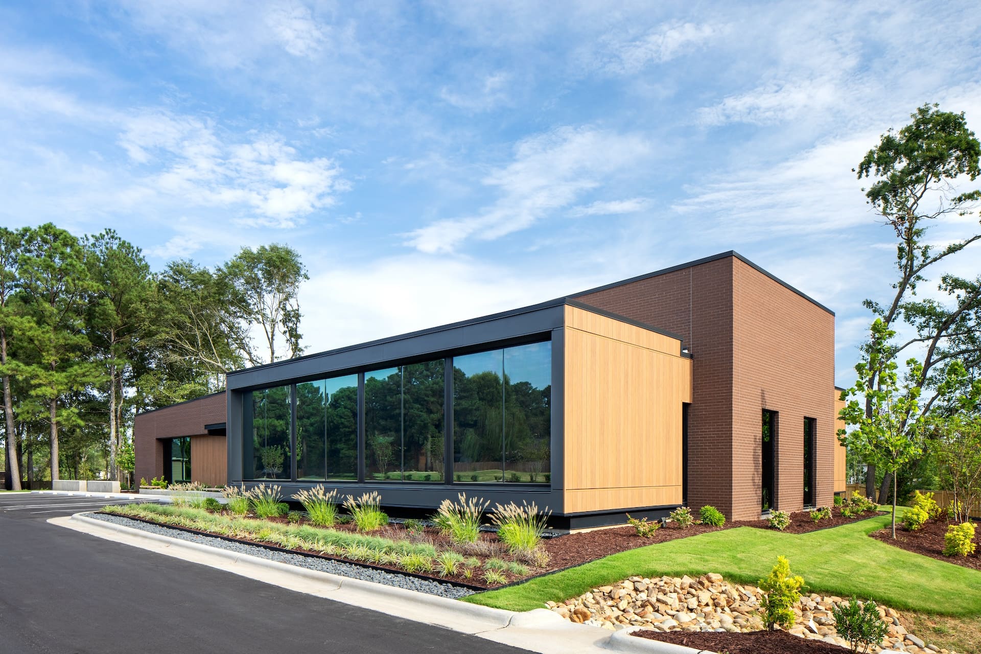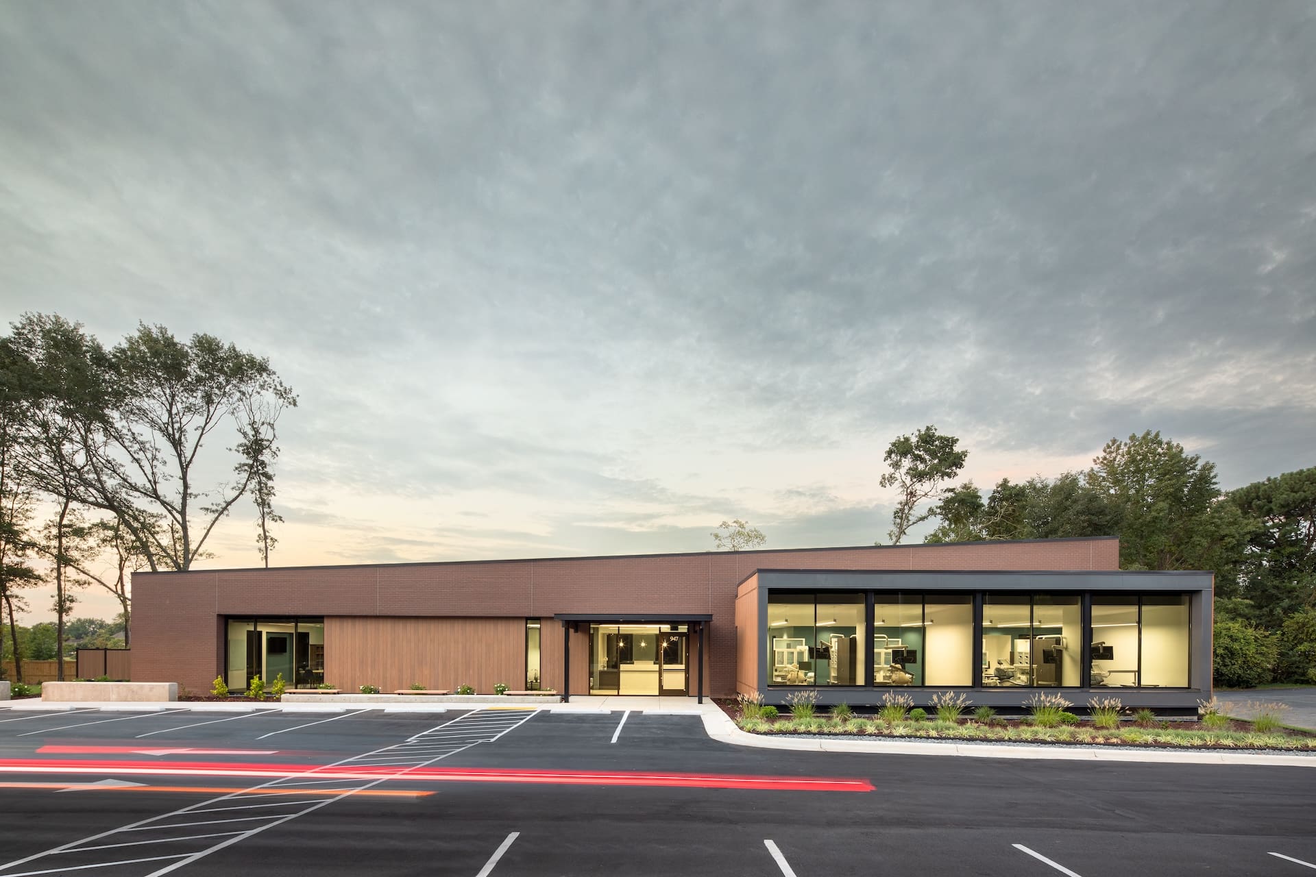 The arrangement of this dental office reflects the practice’s patient-focused mission and optimizes operational efficiency. Spaces for doctors and staff are flanked by patient treatment bays that accept natural light through frame views to the outside. Gardens and landscape on the exterior bring greenery to the foreground and shield pedestrian and vehicular traffic from view. Spaces and circulation are coordinated for caregiver efficiency and a reduced-stress patient experience.