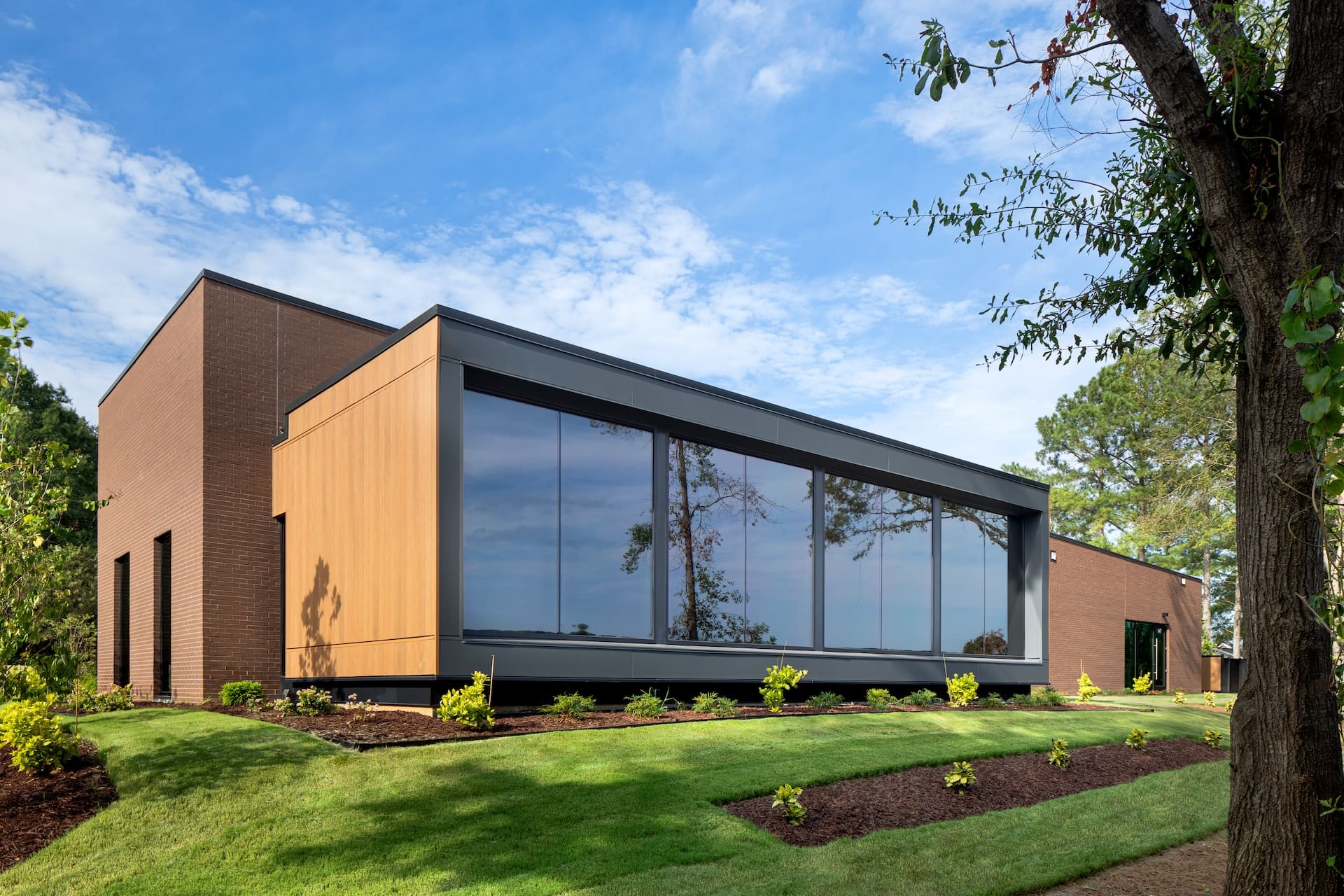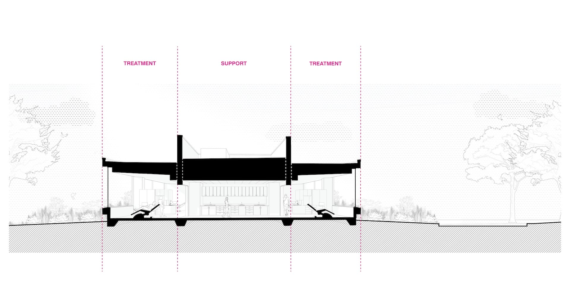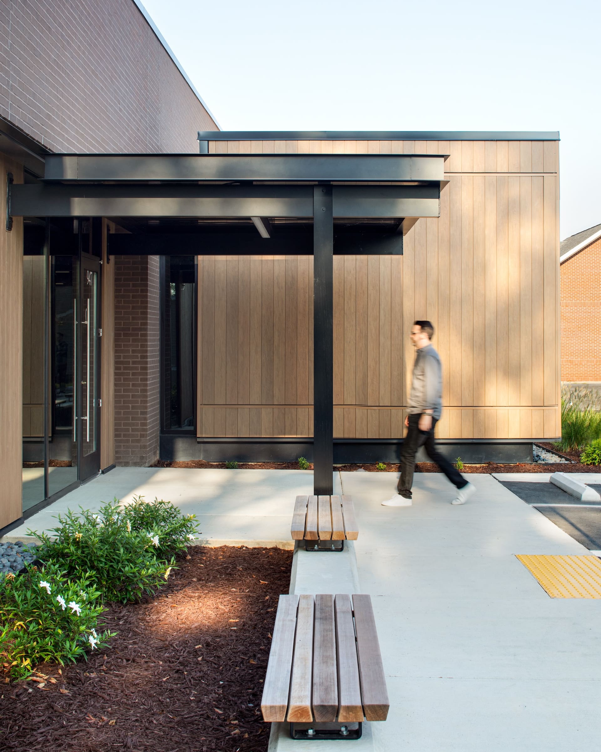 The arrangement of this dental office reflects the practice’s patient-focused mission and optimizes operational efficiency. Spaces for doctors and staff are flanked by patient treatment bays that accept natural light through frame views to the outside. Gardens and landscape on the exterior bring greenery to the foreground and shield pedestrian and vehicular traffic from view. Spaces and circulation are coordinated for caregiver efficiency and a reduced-stress patient experience.