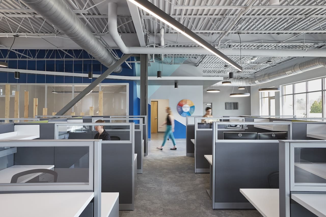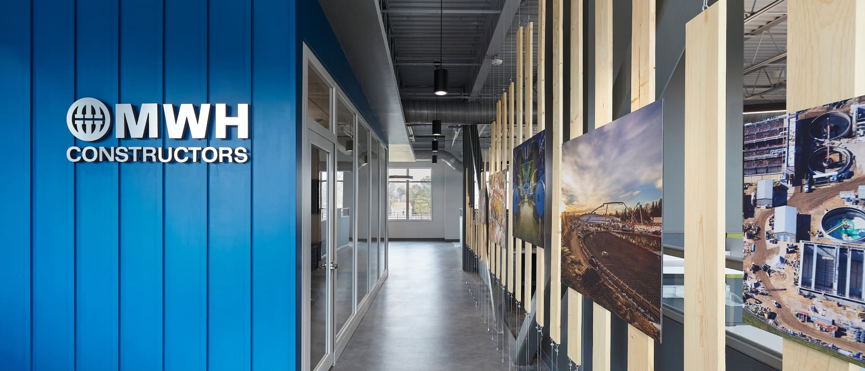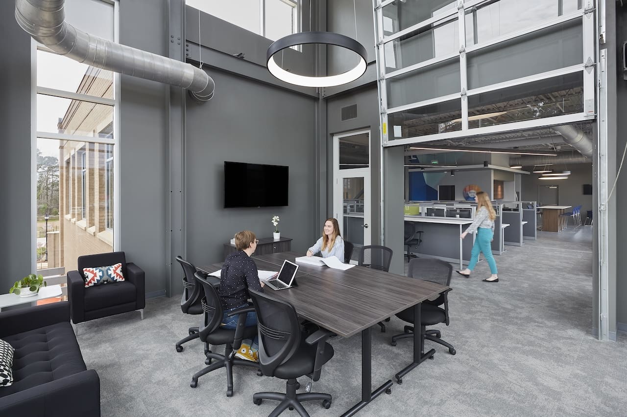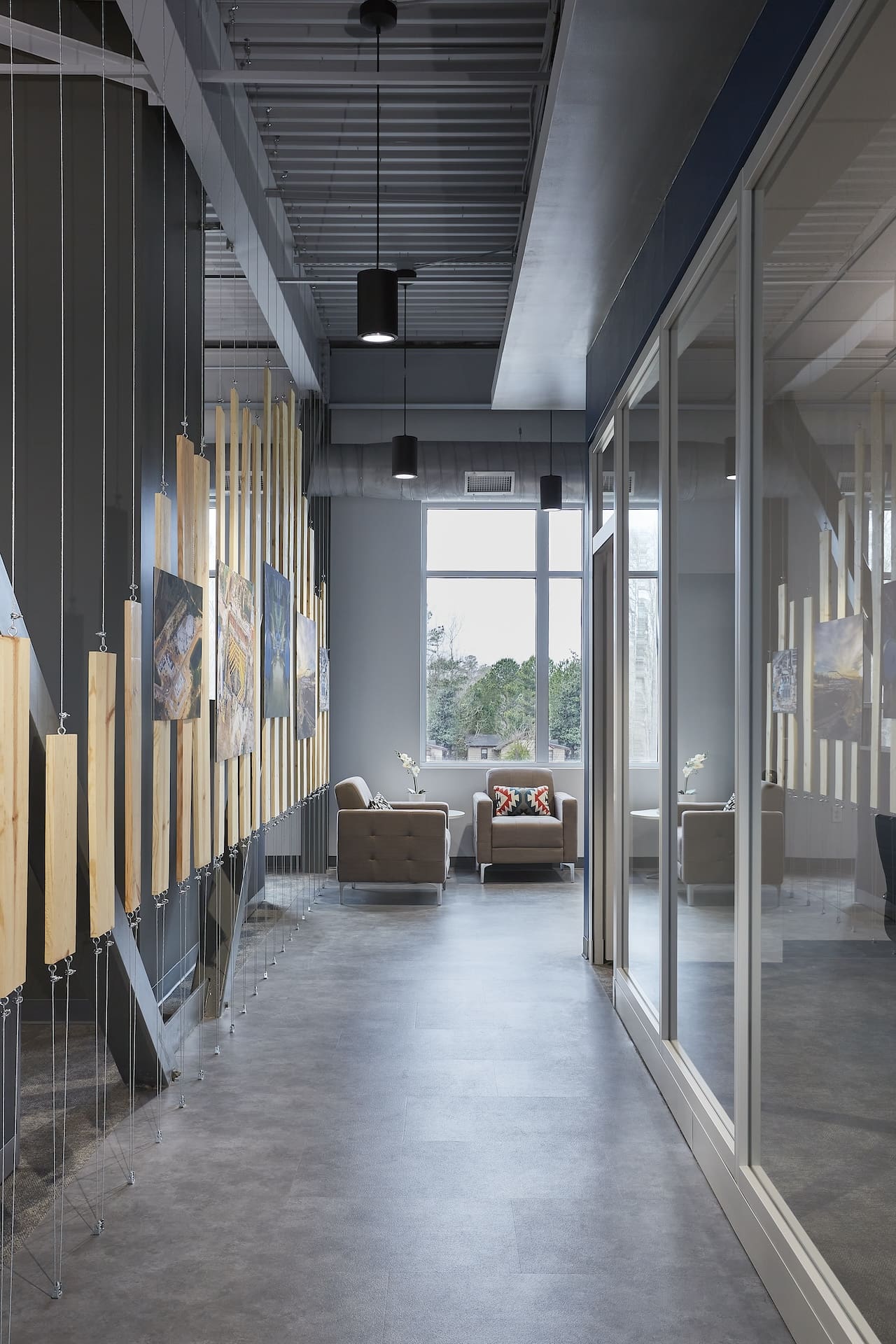 The east coast location for this Colorado based construction company is organized to leverage natural light and promote collaboration. Natural systems that inspire the branding also inform the materiality and furnishings. Public and private work zones are screened or transparent to one another, accommodating individual work style preferences. The main conference room employs a glass overhead door allowing flexibility to accommodate large meetings and gatherings.