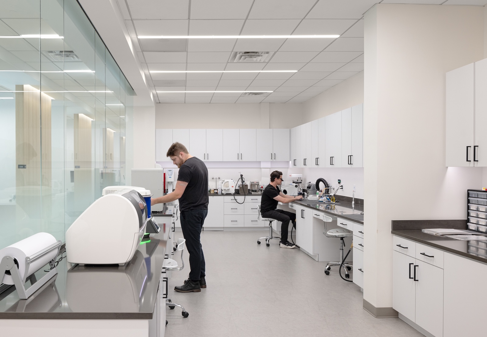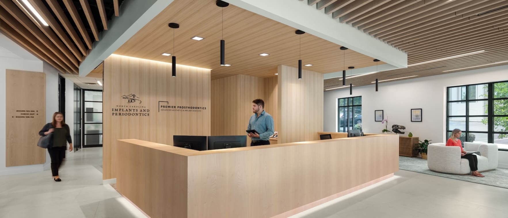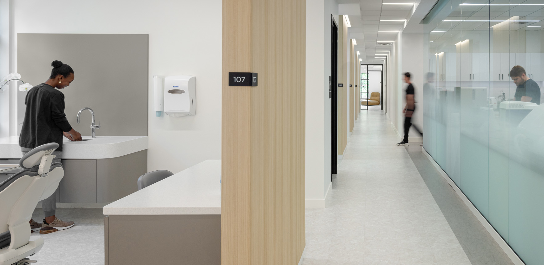 The interior renovation and wayfinding design for this dual practice (periodontics and prosthodontics) is a balanced palette of modern architecture expression and subtle effective signage. Visiting patients are offered clear navigation through the facility while the spatial organization facilitates operational efficiency for doctors and staff. These coordinated design interventions provide a resolved design with primary consideration for the patient experience.