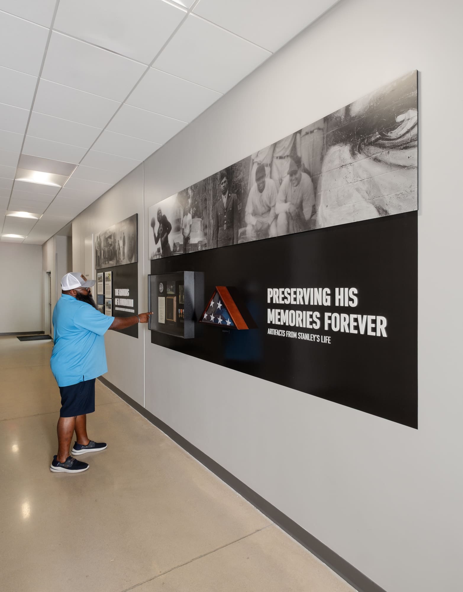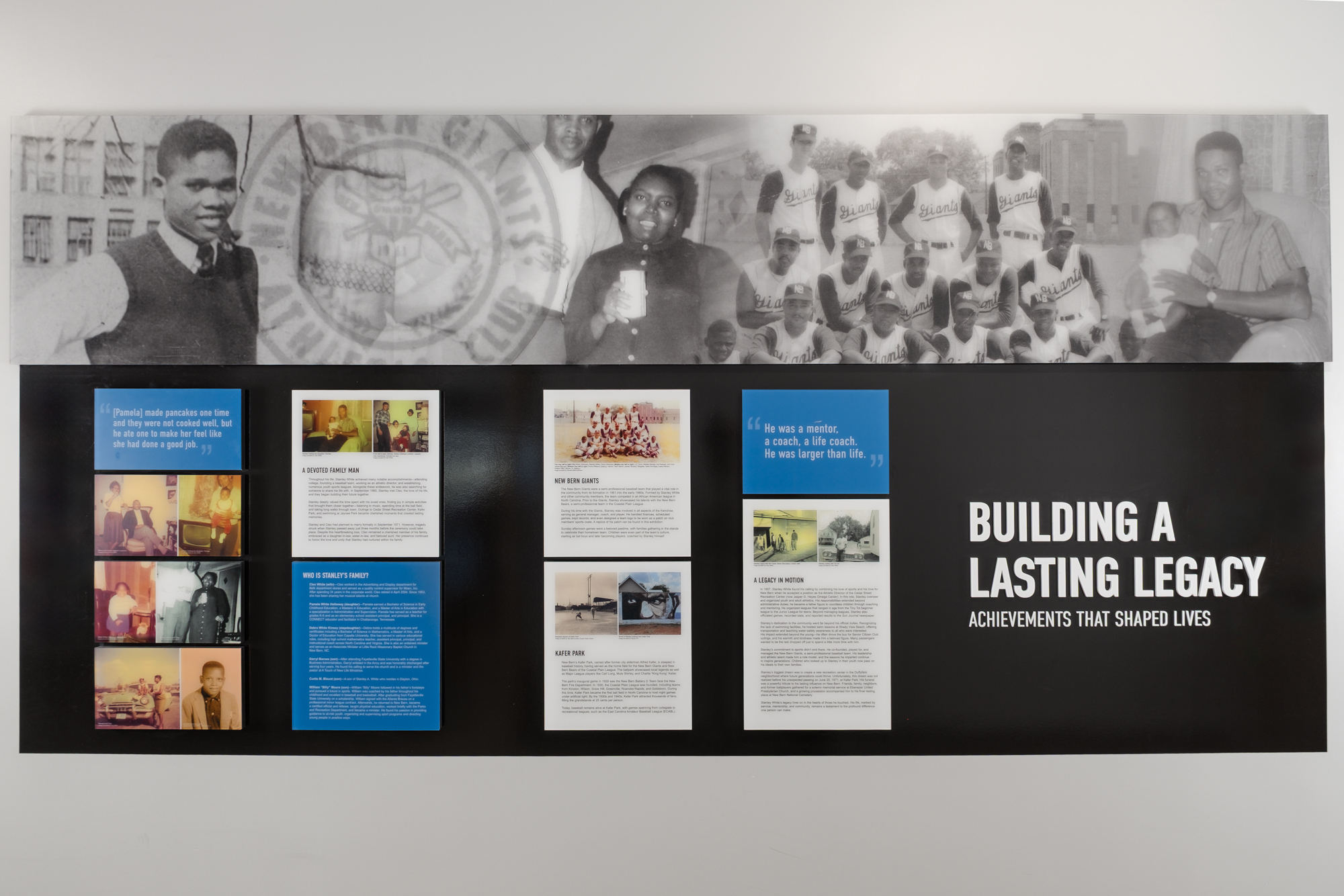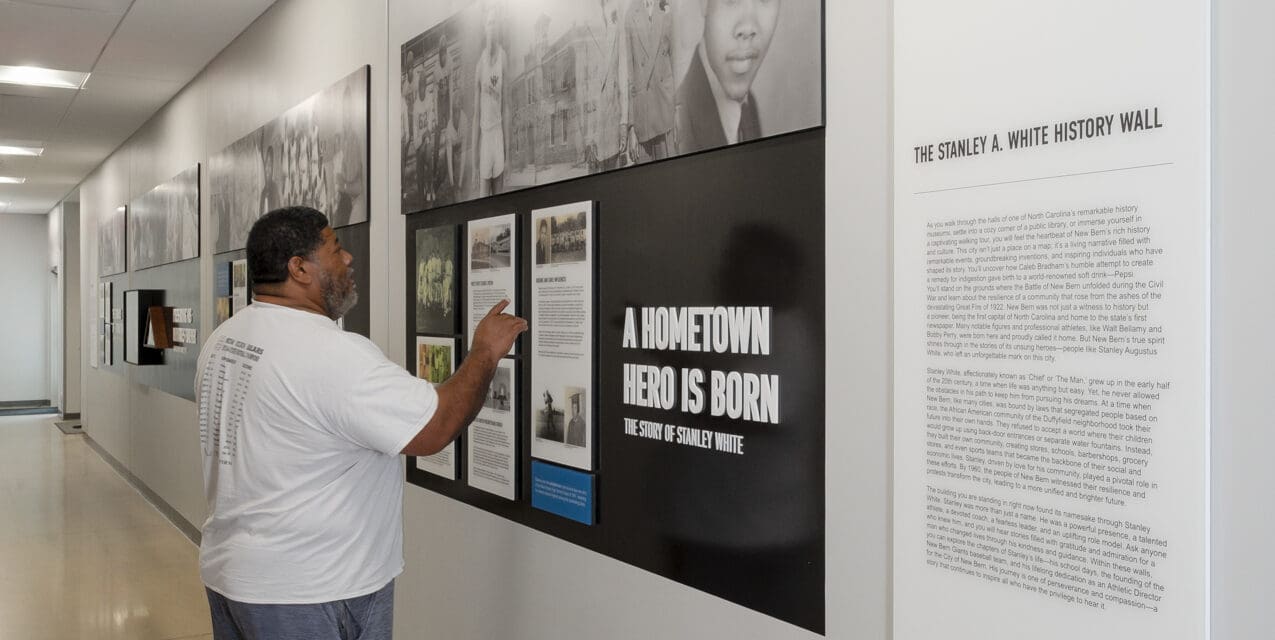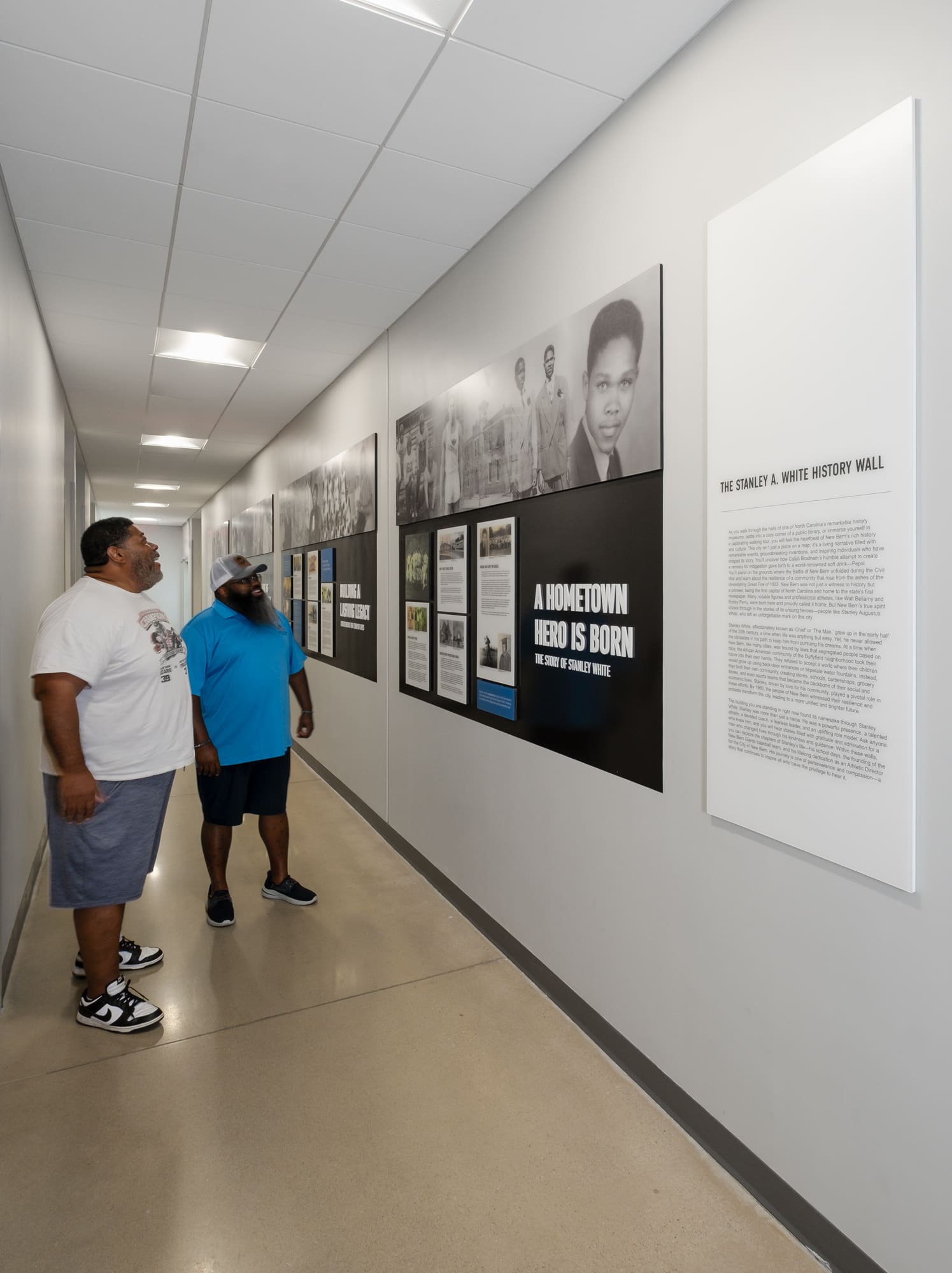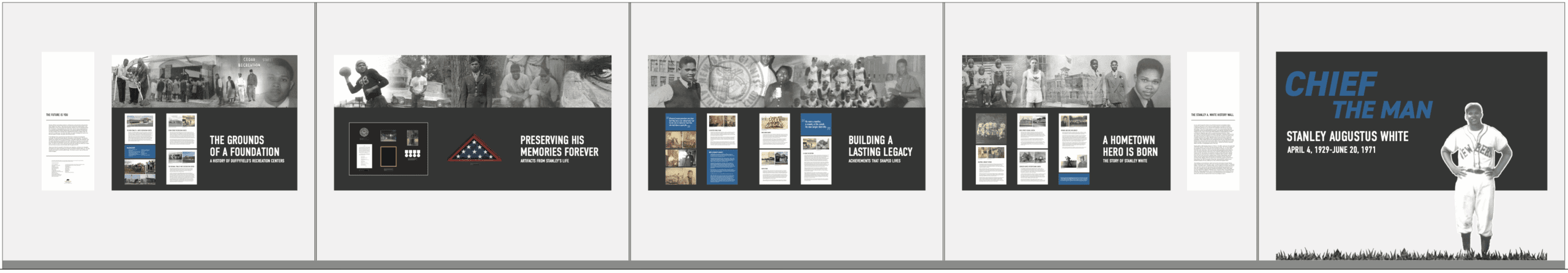 The Stanley A. White Recreation Center History Wall blends storytelling, placemaking, and user-centered design to honor the life and legacy of Stanley Augustus White, a beloved local leader and advocate for youth in New Bern, NC. Developed through deep community engagement and a thoughtful, research-driven process, the installation bridges past and present, serving as both an educational resource and a meaningful experience rooted in place.