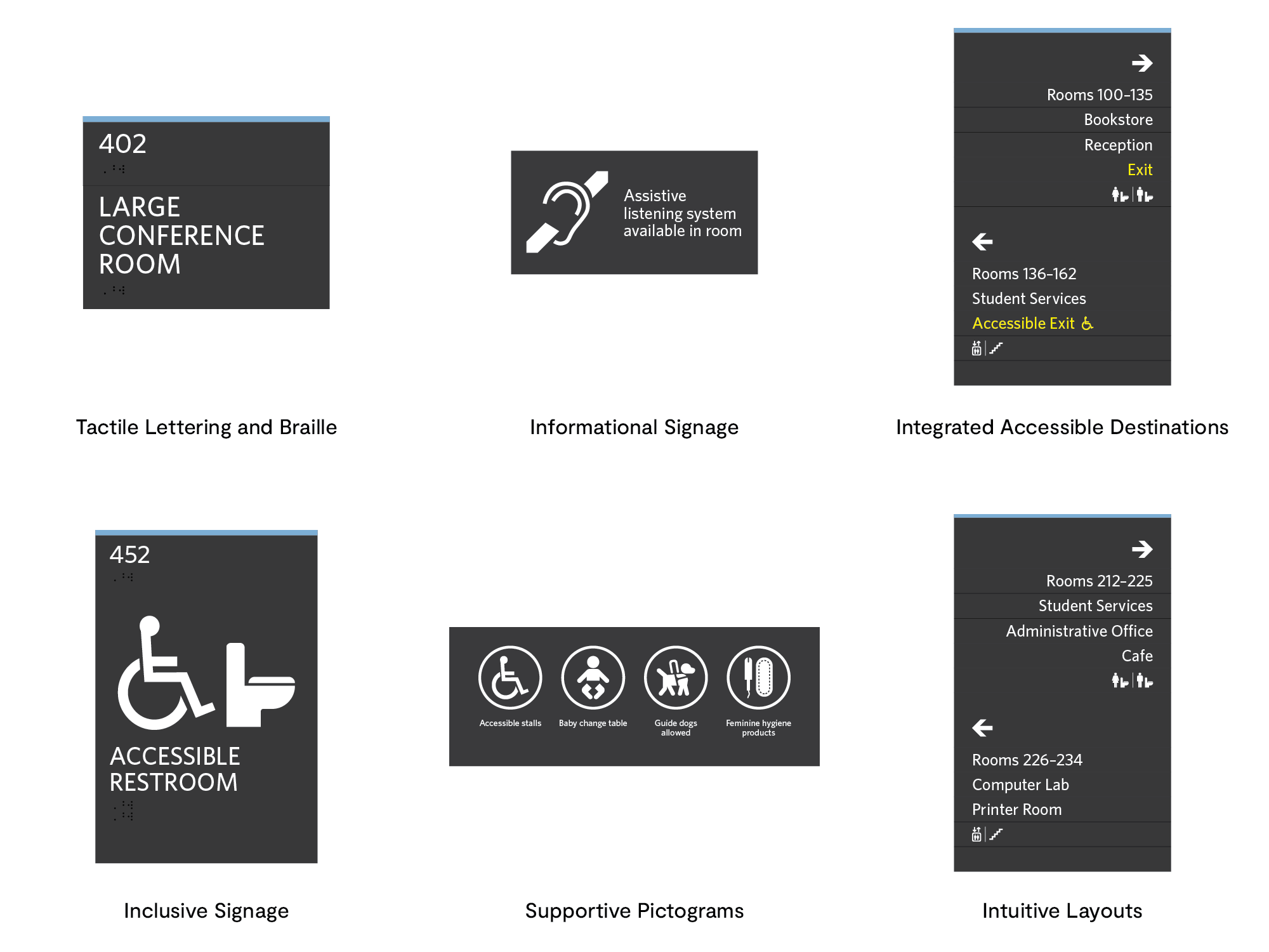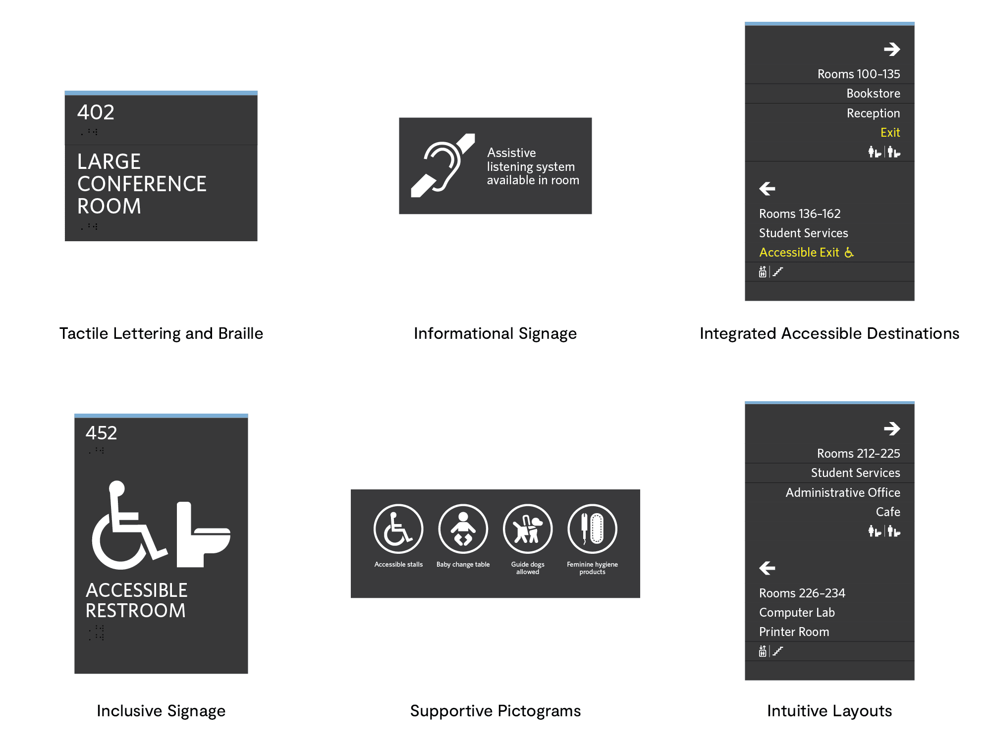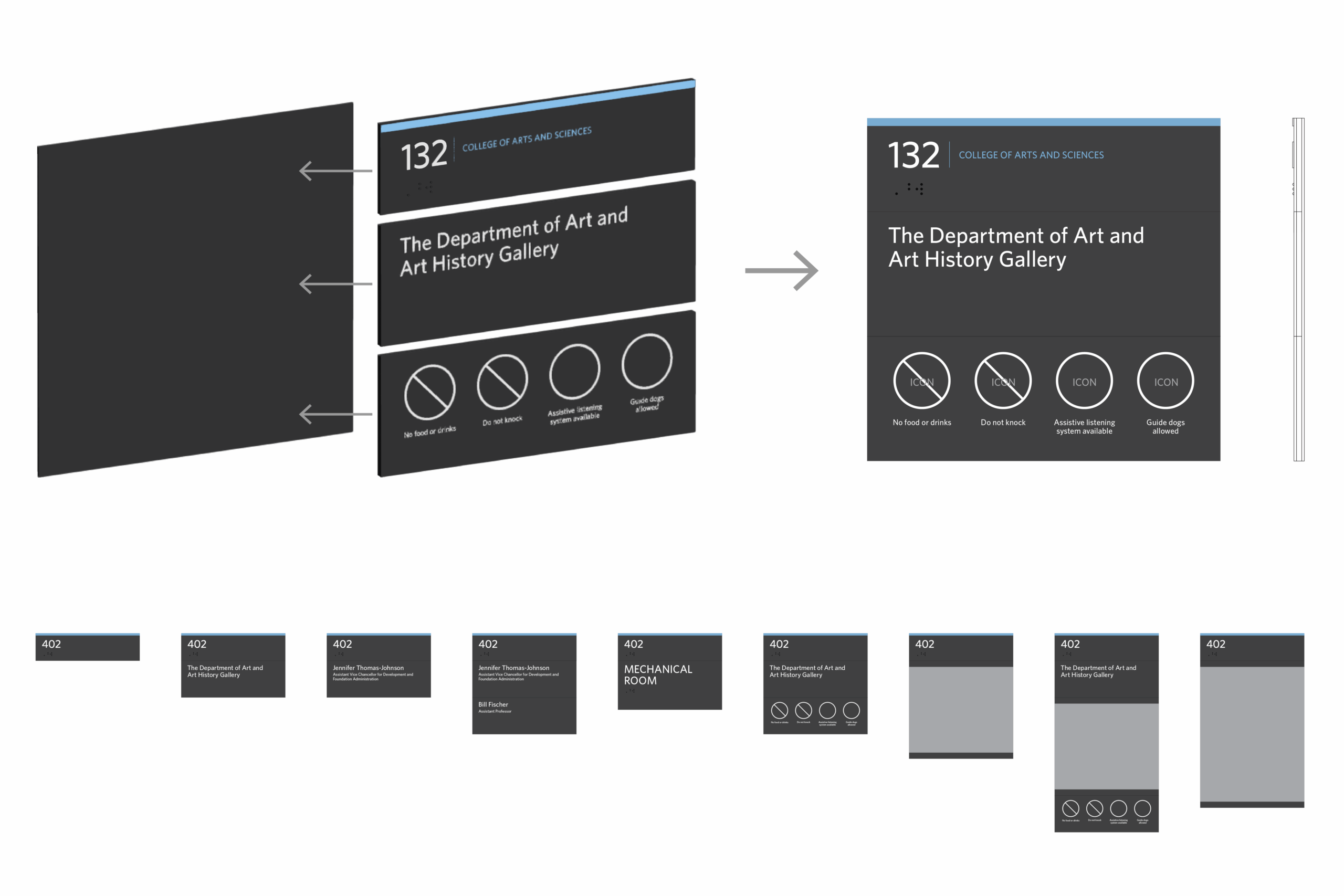 Reconciling a cumbersome and disjointed network of campus signage styles and graphics, these guidelines establish aesthetic and functional standards in alignment with the university brand. Spanning more than 700 acres and encompassing over 500 student organizations, the campus requires a cohesive yet adaptable signage system that allows for customized content and information while improving overall accessibility. The flexible, modular signage design and deployment strategy incorporate universal design principles that accommodate tailored applications specific to campus districts, enhancing inclusivity and navigation for a diverse university community.